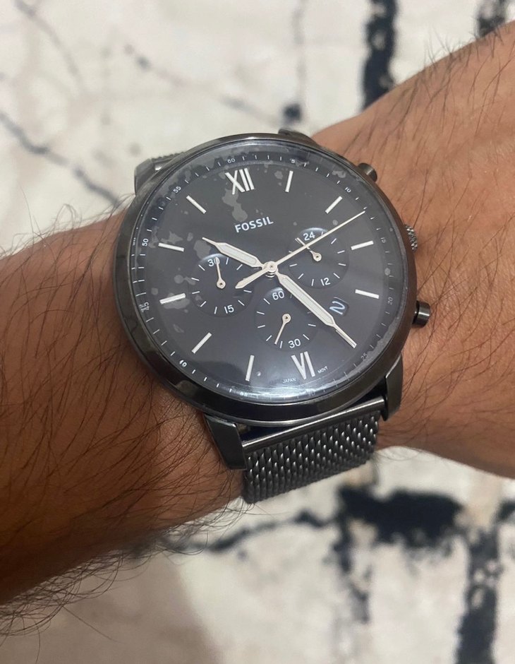 Fossil markalı bu erkek saati, siyah kadranı ve hasır kordonuyla iş ve sokak stilini birleştirir.Almanyadan almıştım bir kaç kez kullanıldı sorunsuzdur⌚