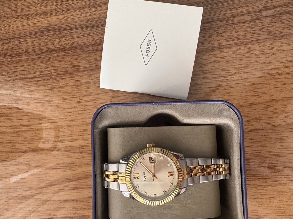 Fossil markalı kadın saati, parlak altın ve gümüş renkli iki tonlu bilezik ve tokalı kapanışa sahiptir. Modern klasik tasarımlı, tarih göstergeli yuvarlak kadranlıdır. ⌚ Yenidir bir kaç kere kullandım garanti belgesi vardır.