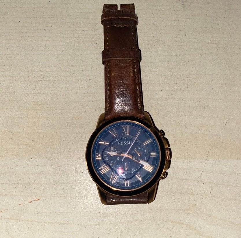 Fossil erkek kol saati, koyu kahverengi deri kayış ve Roma rakamlı klasik yuvarlak kadran ile biker tarzında, kronograf özelliklidir. ⌚ Kordona toka takılmalıdır .