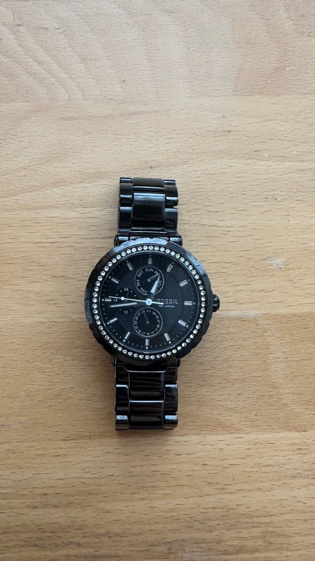 Fossil markalı, tokalı siyah metal kayışlı kadın kol saati. Ürün ayarlı değildir ve pilinin değiştirilmesi gerekli ancak normalde düzgün çalışıyor.