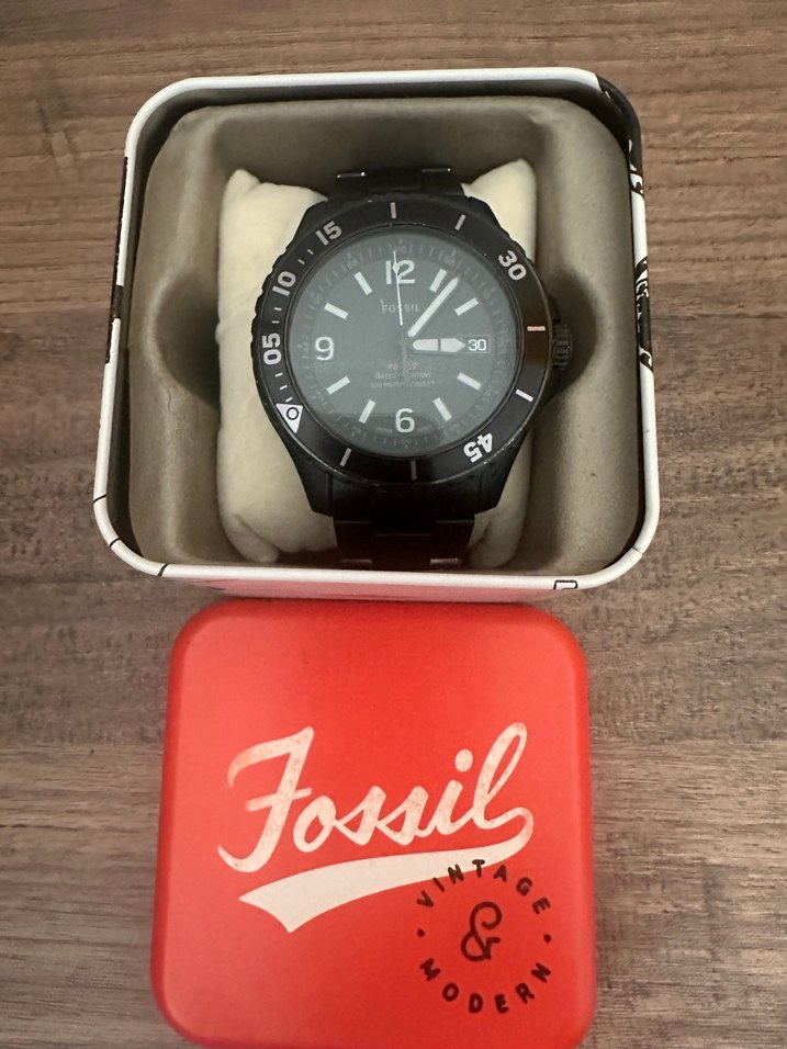 Fossil markalı siyah vintage erkek kol saati, yuvarlak kadran ve tarih göstergesine sahiptir. Özel kutusunda sunulur. ⌚çizikleri var kordon ve ekranda fotoğraflarda gösterilmiştir.