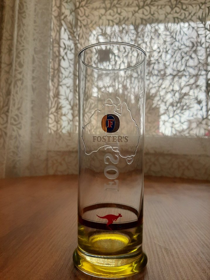 Foster's logosu ve kanguru figürlü, renkli altlıklı uzun cam bardak. İçecekler için uygundur. Avustralya bira bardağı