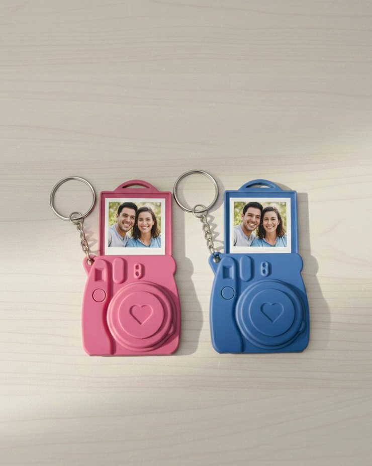 Sevgililer gününe özel Pembe ve mavi renklerde, baskılı fotoğraf çerçeveli renkli retro tarzı kamera anahtarlıkları. 2 li fiyattır.
