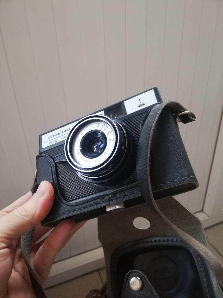 Koyu renkli siyah klasik film kamerası, analog fotoğraf çekimi için taşıma çantasıyla birlikte.