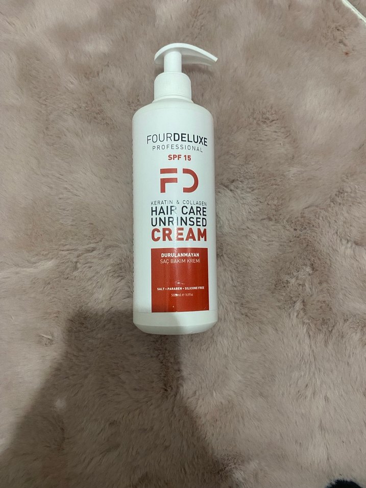 Fourdeluxe Professional SPF 15 içeren keratin ve kolajenli durulanmayan saç bakım kremi, saçları besler ve korur. ♀️Az kullandım denemek amaçlı isteyene uygun fiyatla 500 ML