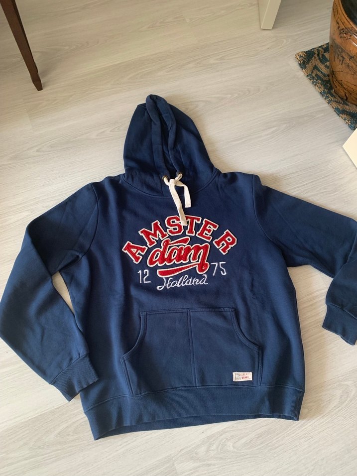 Erkek sweatshirt, kapüşonlu ve uzun kollu, rahat kesim. Yumuşak kumaştan yapılmış, önünde "AMSTER dam 12 75 Holland" baskısı var. Cep detay içerir, koyu mavi renkte. XX large beden kaliteli sadece birkaç defa kullanılmıştır.