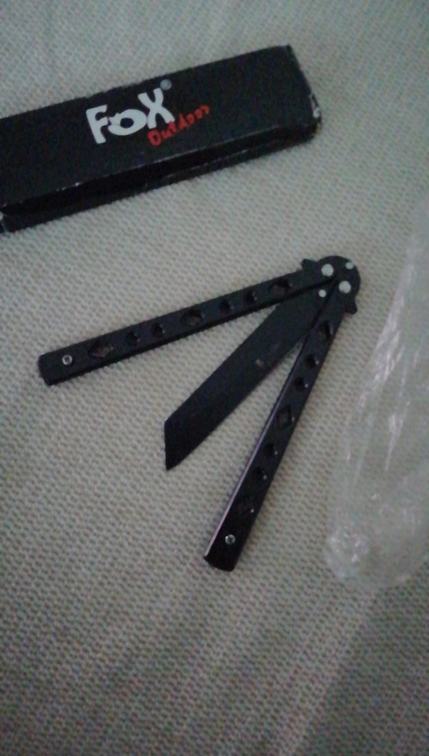 Fox markalı siyah kelebek bıçak, delikli saplarıyla sağlam tutuş sağlar. Katlanabilir ve taşınabilir özellikte.