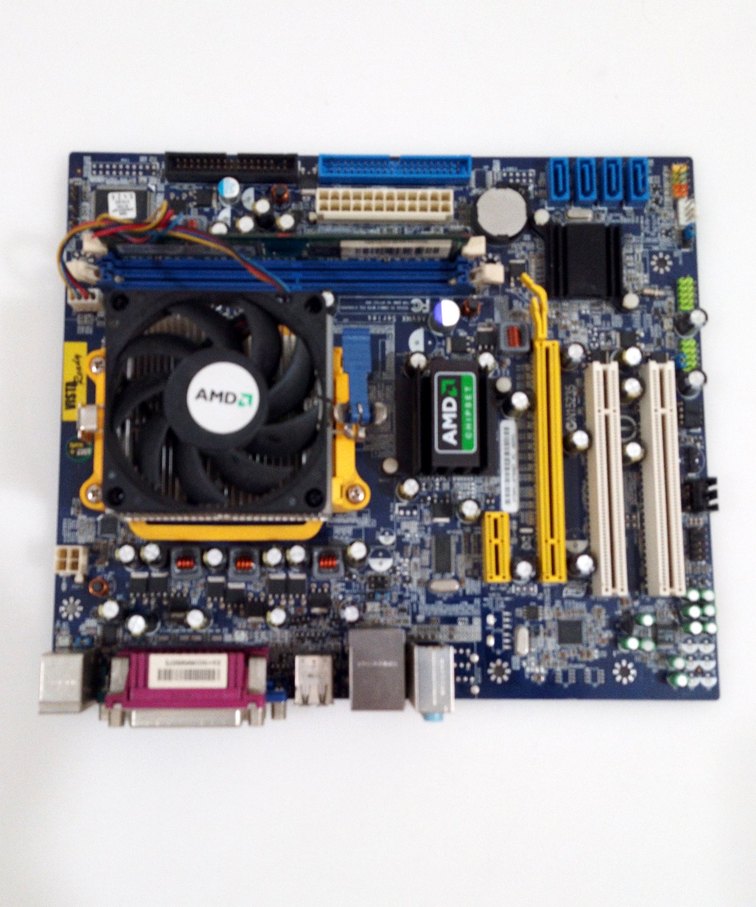 anakart+işlemci+fan // not: ddr2 amd çift çekirdek anakart. onboard ekran kartının köşesindeki kondansatör değişti. bios pili değişti. elimde amd uyumlu sadece 1gb ram var onunla yollarım. ekran ve powerı anakartın çalıştığını göstermek için taktım. onlar ilana ait değil.