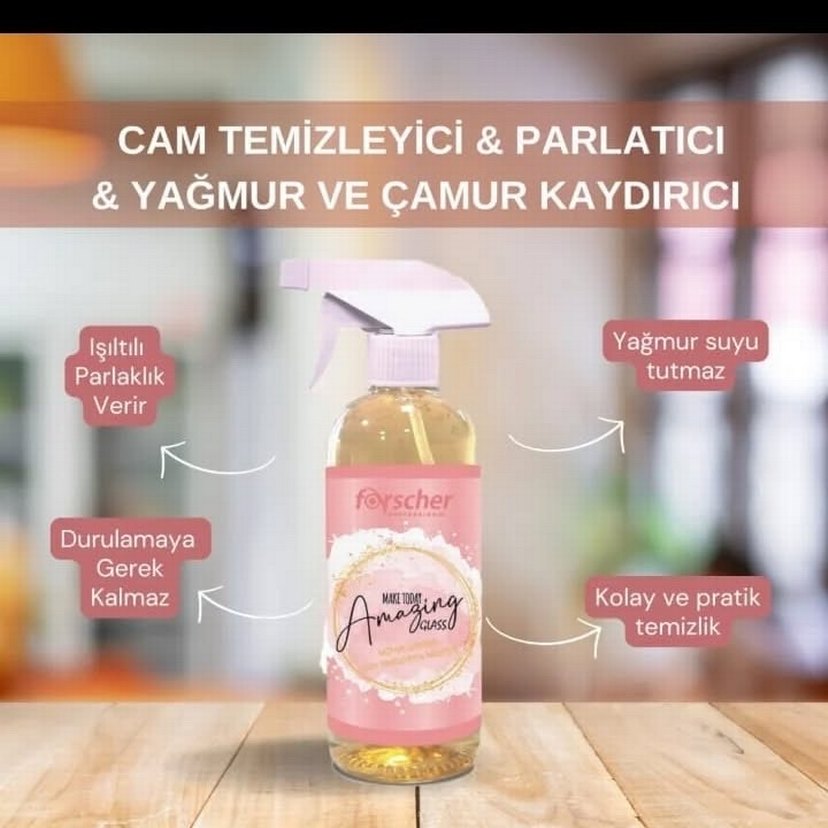Pastel pembe Foyscher sprey, cam yüzeyleri temizler ve parlatır, yağmur ve çamuru kaydırır. Kolay, lekesiz temizlik ve uzun süreli koruma sağlar.