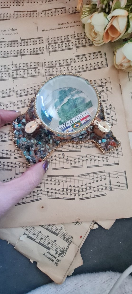 FOZ DO IGUAÇ Hatıra Objeli Vintage Mini Biblo Merkezinde Foz do Iguaçu Şelaleleri görseli bulunan, etrafı doğal taş kırıklarıyla süslenmiş, altın tonlu metal detaylarla çerçevelenmiş nostaljik bir masa üstü parça. 1970’ler–80’ler döneminde özellikle Güney Amerika ve Avrupa turizminde üretilmiş bu tip objeler, hem seyahat hatırası hem de vitrinlik dekor olarak tercih edilirdi. Taş dokusu ve metal çerçevesiyle klasik turistik objelerden ayrılan, karakterli bir örnek. Durum Notu (önemli): Alt bölümde dışa doğru konumlanan altın tonlu metal süslerden biri eksiktir.