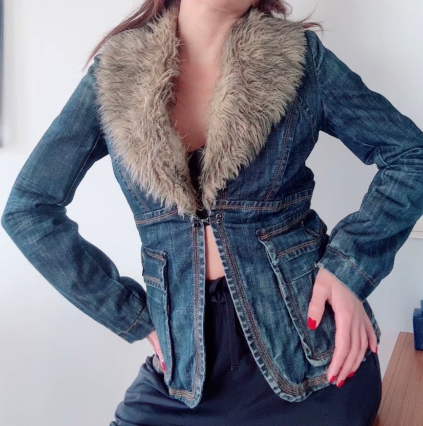 Bu fitted kadın denim ceket, kürklü notched lapel ve uzun kolludur. Rahat streetwear tarzında, desenli ve normal midi uzunluğundadır, günlük kullanım için uygundur. Kürkü çıkıyor İtalya’dan alındı öndeki düğmenin taşı düştü görsel ekli