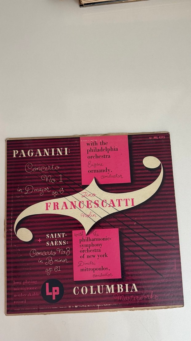 Bu plak, Zino Francescatti'nin Philadelphia Orkestrası ve Eugene Ormandy yönetiminde Paganini'nin Do majör Konçertosu No. 1 ile Dimitri Mitropoulos yönetimindeki New York Filarmoni Orkestrası eşliğinde Saint-Saëns'in Si minör Konçertosu No. 3'ü içerir.