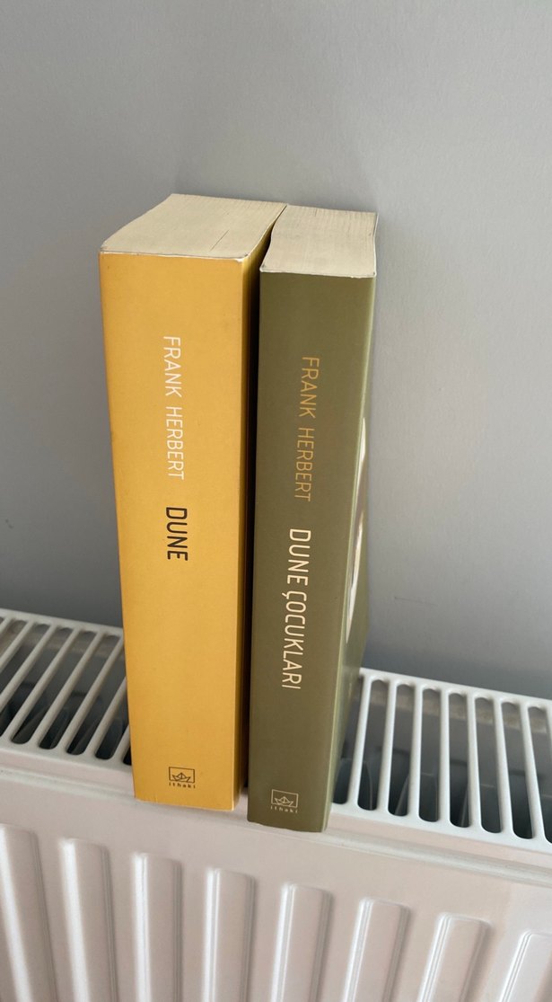 Frank Herbert'in Dune ve Dune Çocukları romanlarından oluşan sert kapaklı iki kitaplık set.