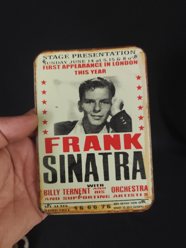 Frank Sinatra Vintage Rock teneke tabela Parlak kahverengi vintage poster, Frank Sinatra sahne sunumu posteriyle, kırmızı ve siyah yazılarla süslenmiş. metal poster