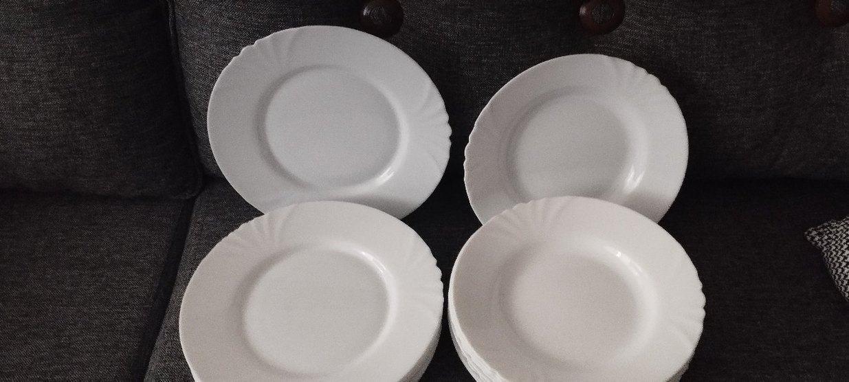 25 cm çapında 9 adet servis tabağı ve 23 cm çapında 9 adet yemek tabağı sorunsuz tertemiz