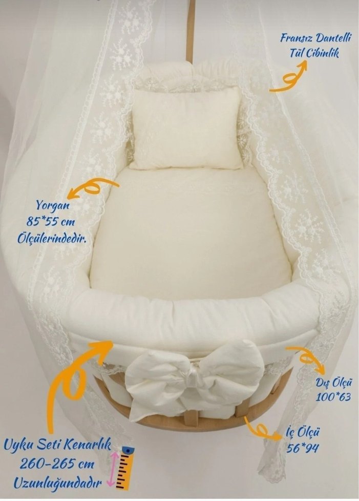 Ahşap beşik, beyaz dolgulu iç kısmı ve fiyonk detaylı dantel tül ile şık ve rahat bir uyku alanı sunar. Krıık beyaz krem renginde.Sıfır ayarında