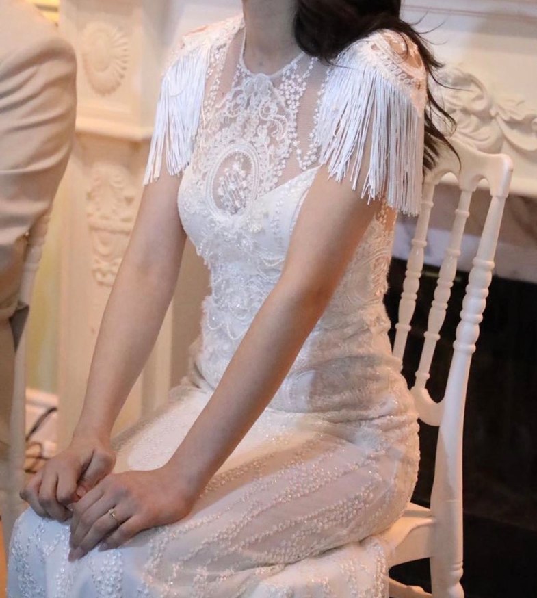 Bohem tarzda, vintage, dantel detaylı, sütyen destekli nişan elbisesi. İşlemeli ve vücuda oturan kesimiyle beyaz renktedir. omuzlarda püskül detayları bulunur. Çekim için sadece 1 saat giyilmiştir.