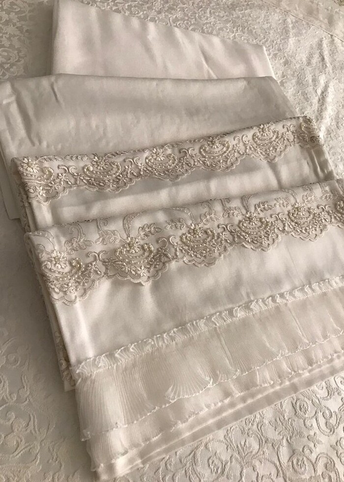 Çeyizime hediye gelmişti hiç kullanılmadı. Kutulu ürün 2 adet dantelli yastık kılıfı iki adet saten yastık kılıfı çarsaf +pike örtü krem rengi