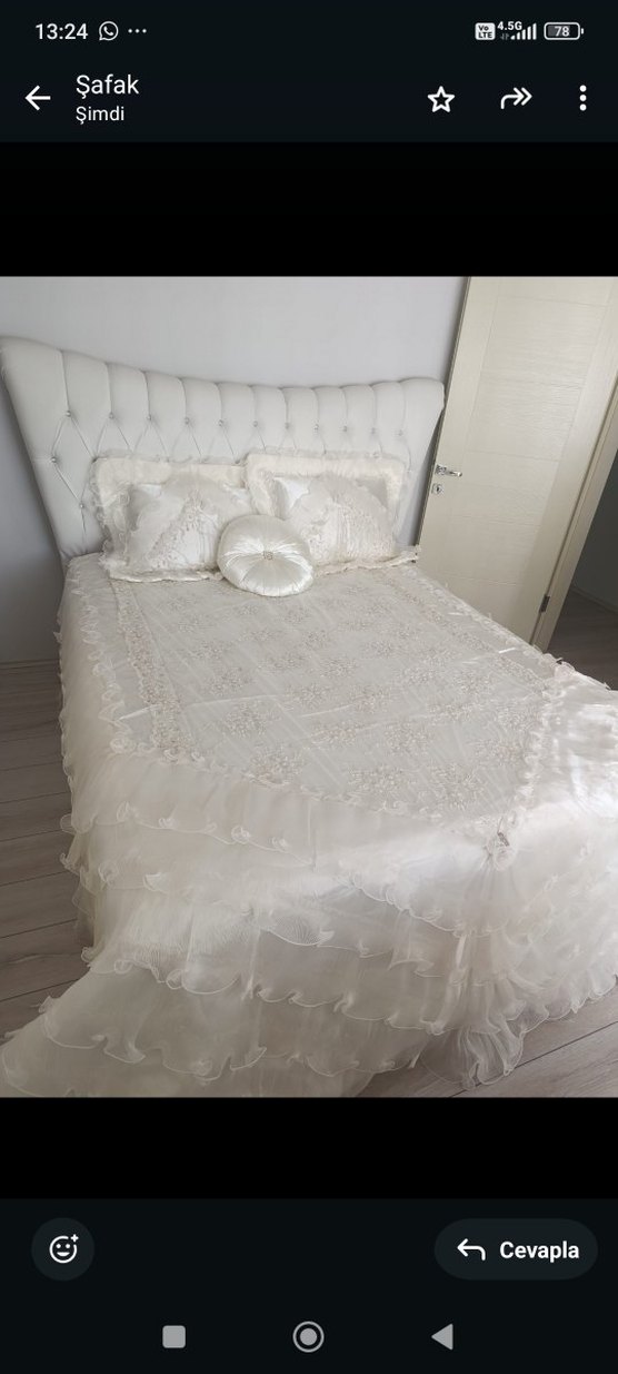 Nakışlı desenlere ve katmanlı fırfırlara sahip beyaz yatak örtüsü, yatak odasına zarif bir dokunuş katıyor. Uyumu sağlayan dekoratif yastıklar dahil.2 Adet yastık ve nevresim mevcuttur. ️