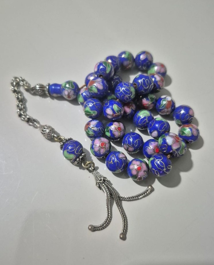 Canlı mineli Fransız işçilik gümüş ve çiçek desenleriyle renkli tesbih, gümüş 10 mm zincir detaylarıyla tarz.