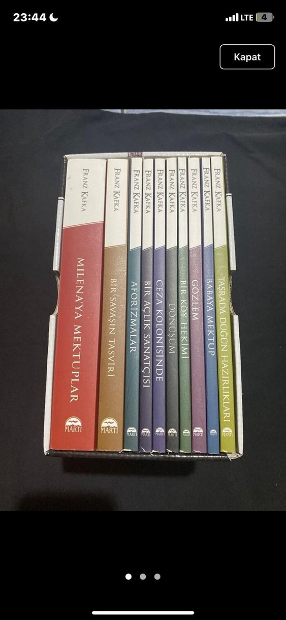 Franz Kafka'nın 10 kitaptan oluşan seti. "Milena'ya Mektuplar," "Bir Savaşın Tasviri," "Ceza Kolonisinde" gibi eserler içerir. Martı yayınevinden.