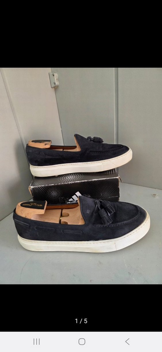 Siyah süet malzemeden yapılmış, püsküllü ve kalın beyaz tabanlı erkek loafer ayakkabılar. Günlük sokak stiline uygun, rahat ve desensiz. orjinaldir. iç tabanlığı olmadığı için uyguna ekledim.
