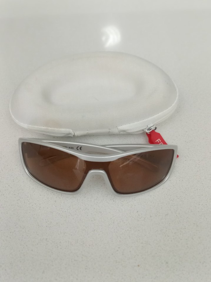 Kaliteli,az kullanılmış,kusursuz,çocuk güneşiiüi.Beyaz çerçeveli, kahverengi camlı kadın güneş gözlükleri, beyaz koruyucu kılıf ile birlikte sunuluyor. Minimalist ve avangart tarzıyla dikkat çekiyor.️