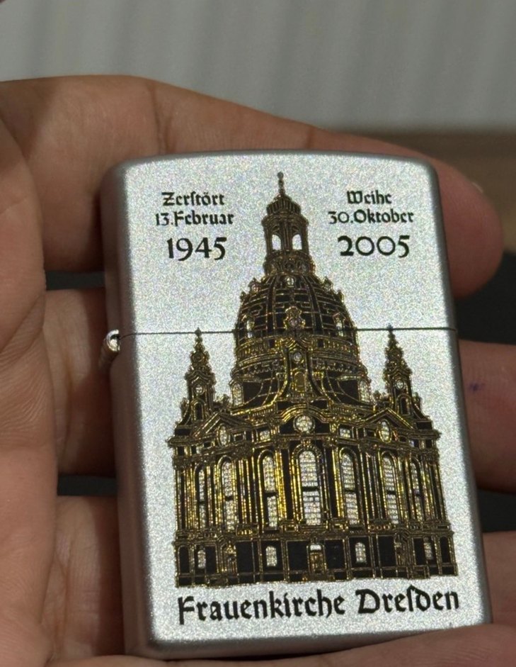 Bu çakmak, Frauenkirche Dresden'in 13 Şubat 1945'teki yıkımını ve 30 Ekim 2005'teki kutsanmasını anan detaylı bir tasarıma sahiptir. Tarihi önemi vurgulanır. Orjinalliği teyitlenmiş Almanya özel üretimi zippo. Üzeri altın çakımdır limitli özel seri