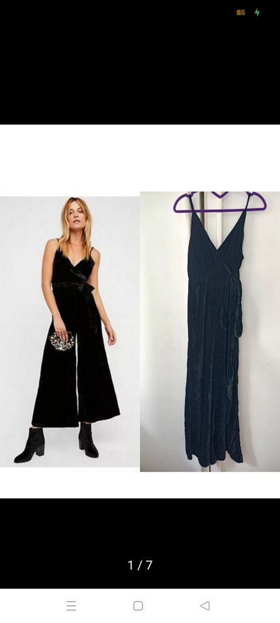 Siyah kadife kumaştan, askılı ve bol kesim uzun tulum. Bel detayı ile avangart tarzlar için uygun, romantik akşamlar için ideal. 98 $ etiketi üzerinde. paça boyu kısadır. fotoları iyi inceleyin. son fotoda ölçüleri bulabilirsiniz