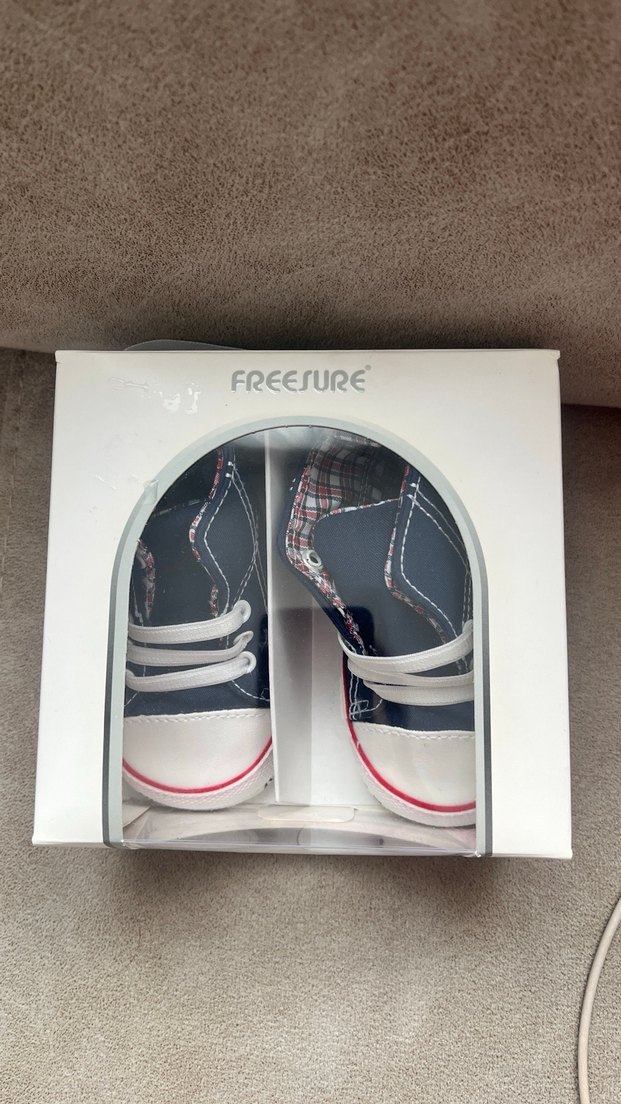Erkek bebek ilk adım ayakkabısı, baskılı desenli ve mavi-gri renklidir. Kauçuk malzemeden yapılmış, kolay giyilmesi için cırt cırtlı kapama vardır. FREESURE markalıdır. Hiç kullanılmamıştır.