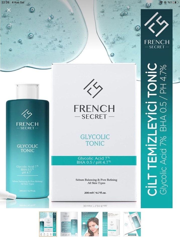 French Secret Glikolik Tonik, %7 glikolik asit ve %0.5 BHA içerir. pH 4.7 ile sebumu dengeler, gözenekleri inceltir. 200 ml şişede, tüm cilt tipleri için uygundur.