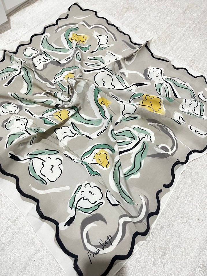 Gri renkte, ipek görünümlü ve drapeli bohem tarzda kadın fular. Sanatsal çiçek desenleriyle Parisian retro havası taşıyor.