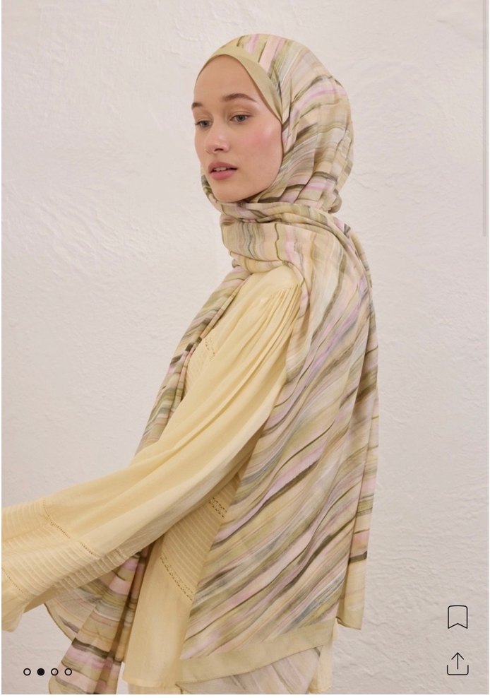 Sarı renkte, pastel tonlarda dokulu dökümlü kadın şalı, yumuşak sentetik kumaştan yapılmıştır ve mütevazı bohem tarzını yansıtır.