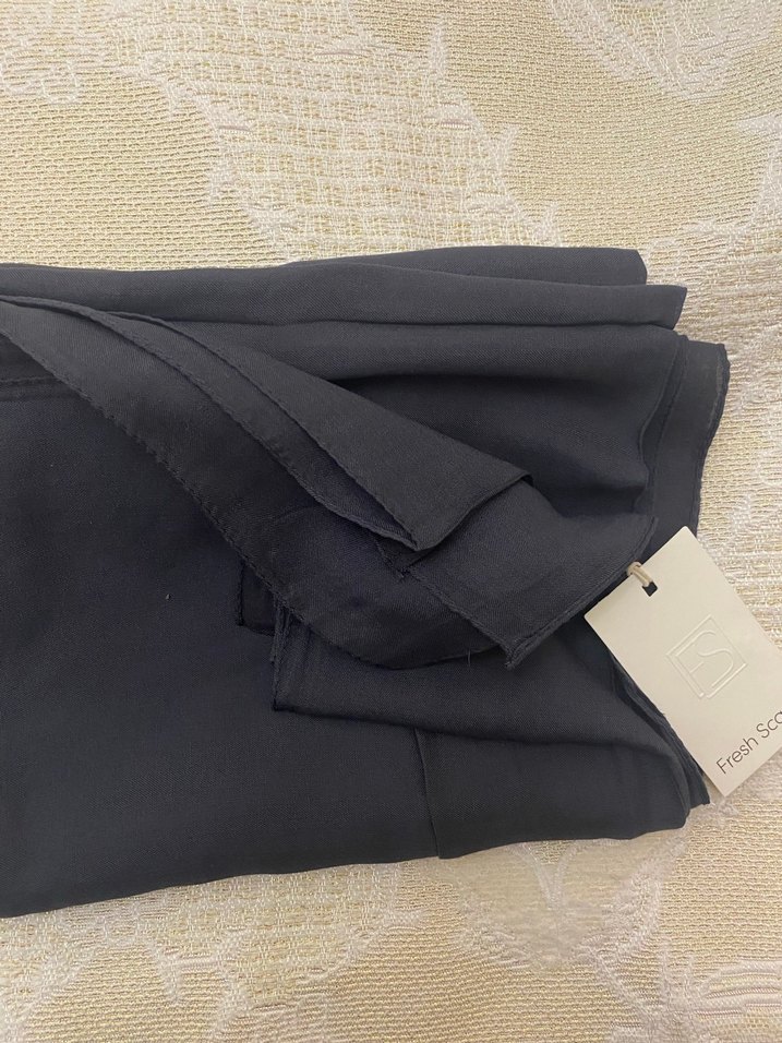 Siyah kadın saten şal, yumuşak dokusu ve drapeli tasarımıyla rahat ve sade bir stil sunar. RAMİ ŞAL