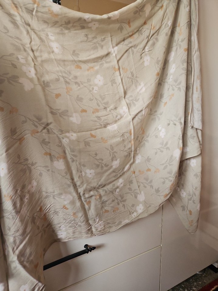 Yumuşak kumaştan yapılmış, bej zemin üzerine gri ve beyaz çiçek desenleri bulunan nevresim. yenidir fresh şal