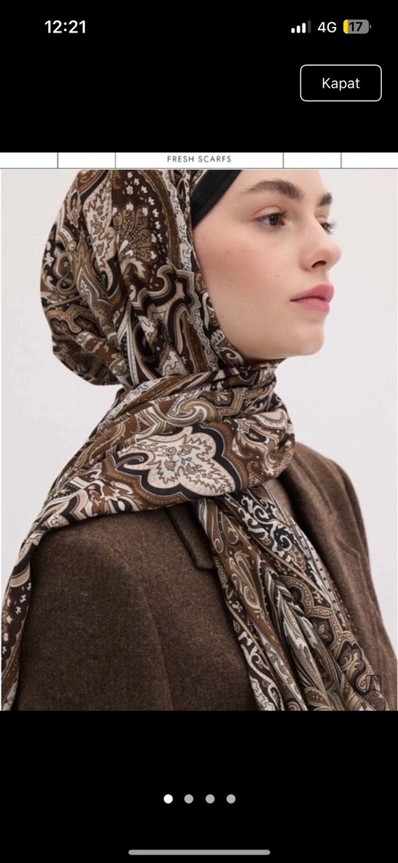 Koyu kahverengi, pamuklu ve bohem desenli, kadın şalı. FRESHSCARFS markalıdır.