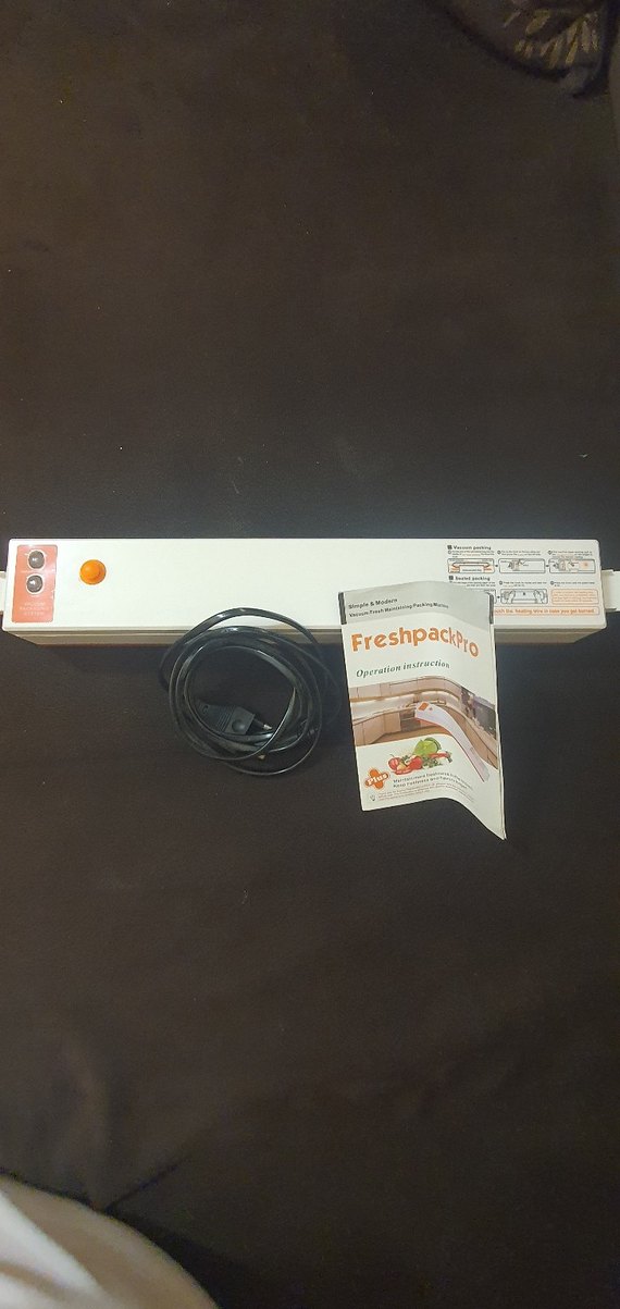 FreshpackPro Gıda Vakumlama cihazı, açık renkli tasarımı, basit kontrol düğmeleri ve güç kablosu ile birlikte kullanım kılavuzu içerir. Sayılı kullanıldı, kutusu mevcut değil, vakumlama poşetleri internette mevcuttur.
