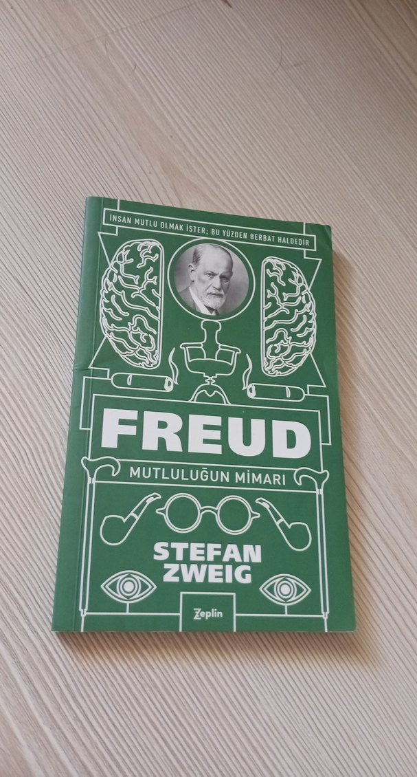 Stefan Zweig'in yazdığı "Freud Mutluluğun Mimarı" kitabı, mutluluk ve psikoloji üzerine derinlemesine bir inceleme sunuyor. Yeşil kapak, Freud'un fotoğrafı ve beyin temalı çizimlerle dikkat çekiyor.