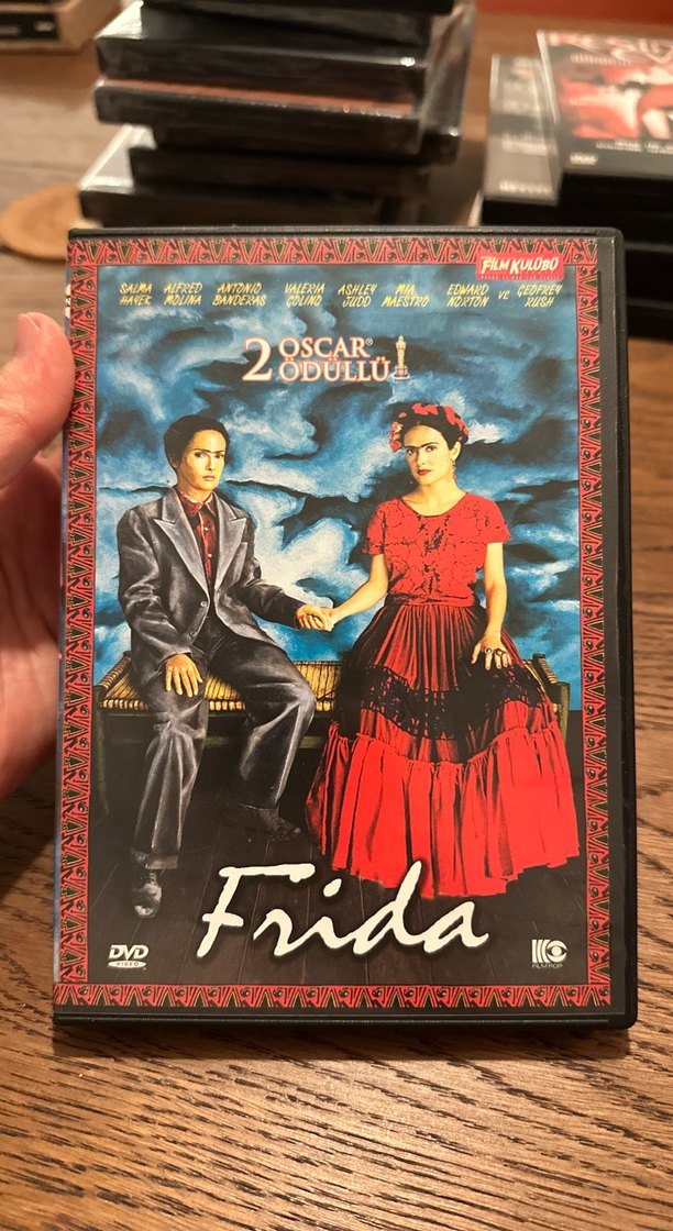 2 Oscar ödüllü "Frida" filminin DVD'si, döneme uygun kostümlerle ana karakterlerin yer aldığı dramatik kapak.