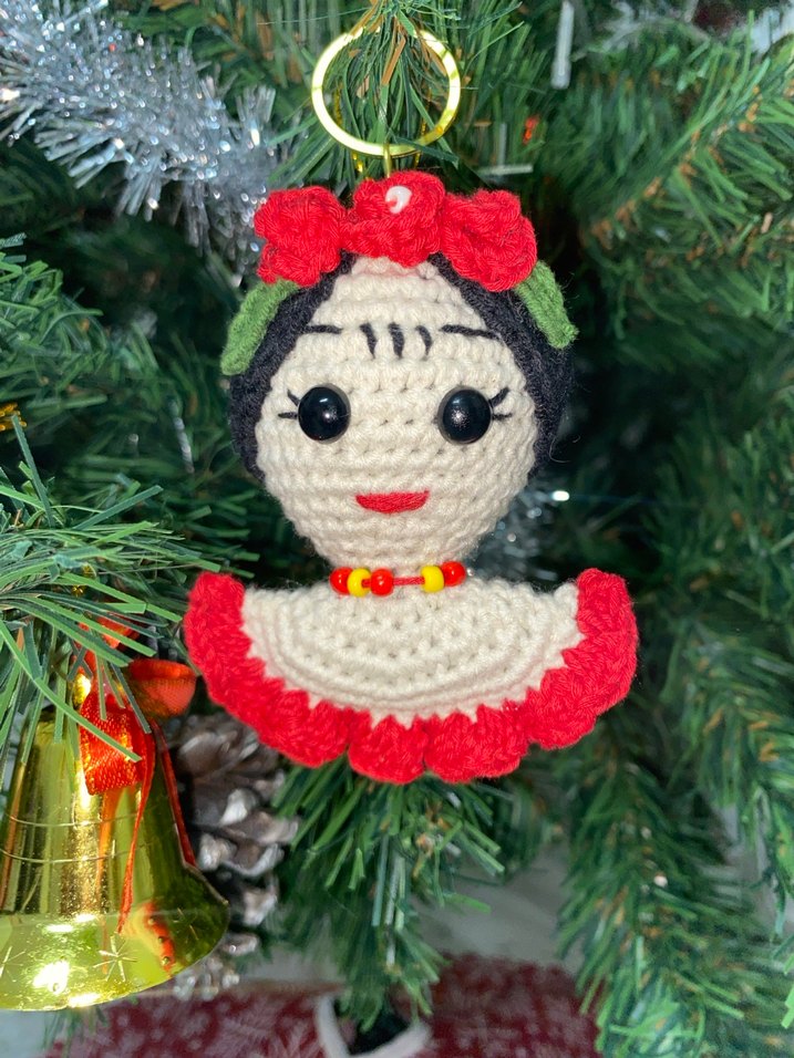 Kırmızı çiçekli taç ve kolyeye sahip, siyah gözlü renkli örgü bebek anahtarlık.