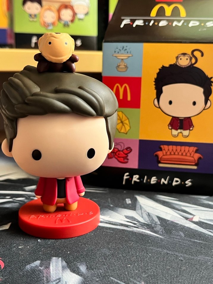 Kahverengi saçlı karakter ve kafasında küçük maymun bulunan, kırmızı tabanlı renkli Friends figürü. Canlı tasarımlı kutu ile birlikte.