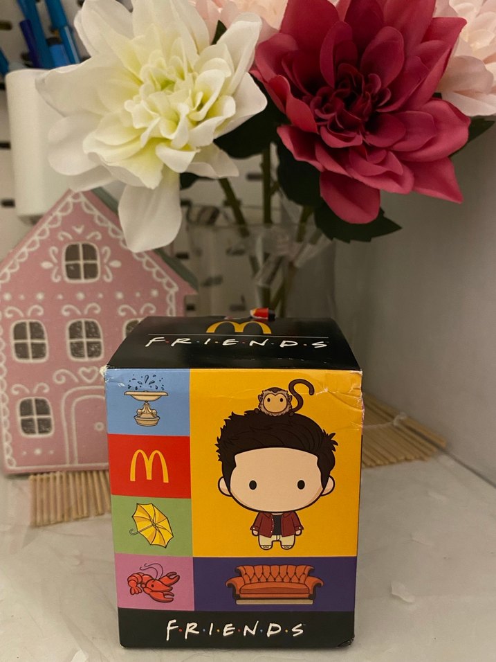 Renkli kutuda Friends temalı, kafasında maymun figürü olan aksiyon figürü.