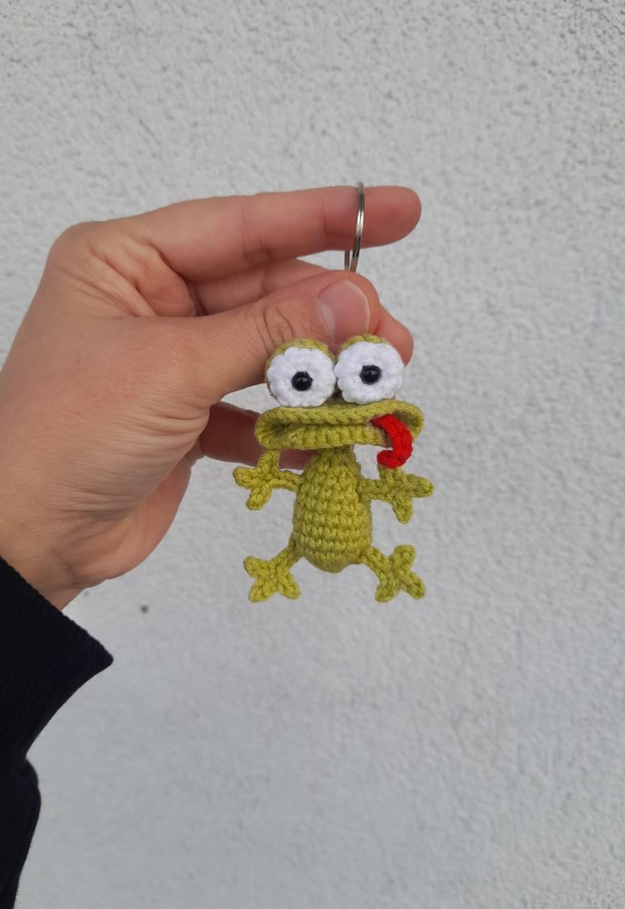 Büyük beyaz gözleri ve kırmızı dil detayı olan, renkli örgüden yapılmış eğlenceli kurbağa şeklinde anahtarlık. Bohem ve retro tarzlara uygun.