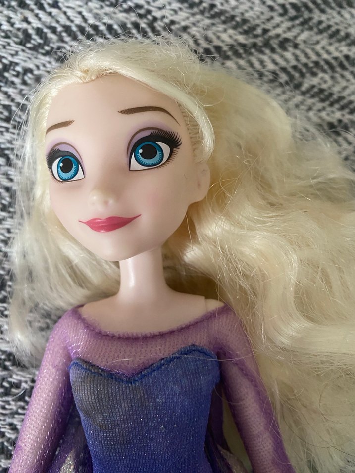 Uzun sarı saçlı ve mavi gözlü bu bebek, transparan detaylı pastel mor elbise giymektedir. Yüz hatları detaylıdır ve saçları yumuşaktır. Elbisesinde leke var çıkar diye düşünüyorum