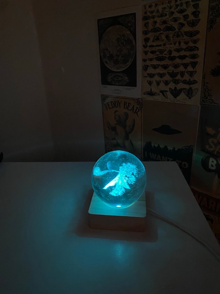 Mavi ışıklı 3D küre masa lambası, içinde parlayan karahindiba tasarımıyla sade bir kare taban üzerinde duruyor. Yumuşak ortam aydınlatması sağlar.