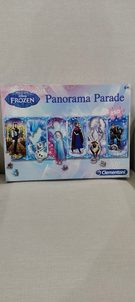 Renkli Frozen temalı Panorama Parade yapbozu, 250 parçadan oluşur ve 6 yaş ve üzeri çocuklar için uygundur. 6 resim 6 puzzle ana her resim ortak parçalarla birleşiyor. Biz kızınla yaparken çok eğlenmiştik Artık büyüdü. şimdi sıra sizdeeksik parça yok