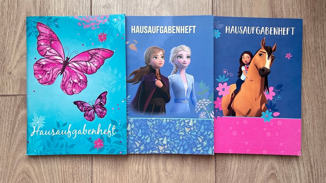 Frozen temalı Hausaufgabenheft, kapakta Anna ve Elsa karakterleri ve alt kısımda mavi çiçek desenine sahip.