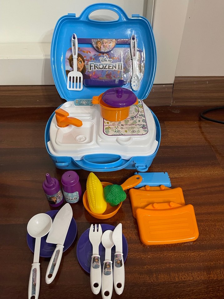 Frozen temalı, mor renkli oyuncak mutfak seti. Tencere, tava, çatal, kaşık ve oyuncak yiyecekler içerir.