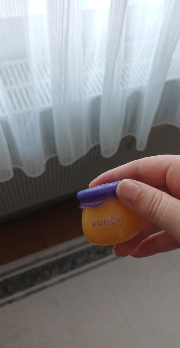 Mor kapaklı küçük kavanozda FRUDI dudak bakım kremi, dudakları nemlendirir ve korur.