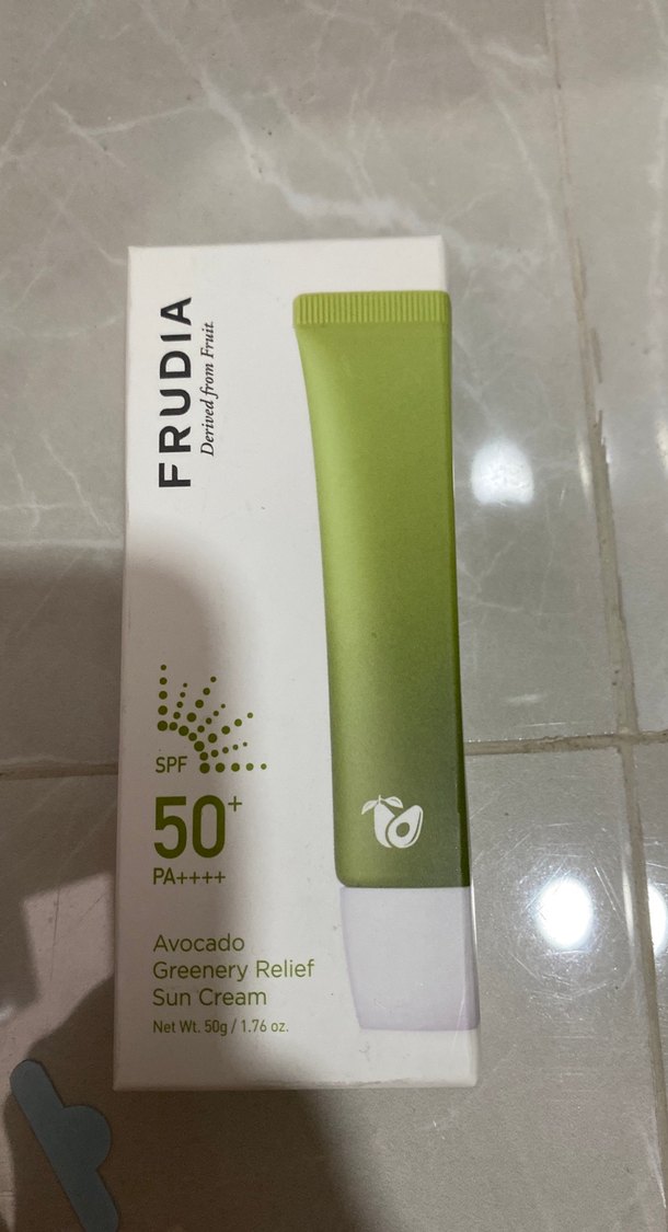 Frudia Avokado Greenery Relief Güneş Kremi, SPF 50+ ve PA++++ koruma sağlar. 50g'lık tüp formundadır.